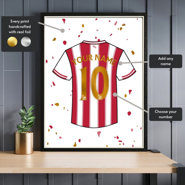 Personalise the design with any name and number for a standout piece inspired by the club’s iconic red and white stripes. Printed on premium gloss paper, the foil adds a bright, modern shine.